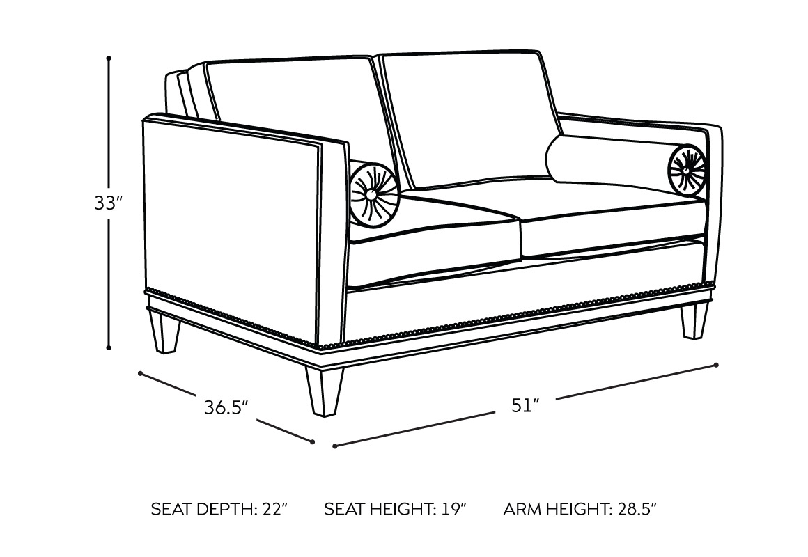 This exquisite show-wood loveseat design comes standard with metal nail head trim and includes a pair of round bolster pillows in the same fabric you choose for the loveseat. You can also choose a single bench seat cushion or two over two for the loveseat. There are so many wonderful choices to make this your very own creation and we’re here to help you every step of the way.