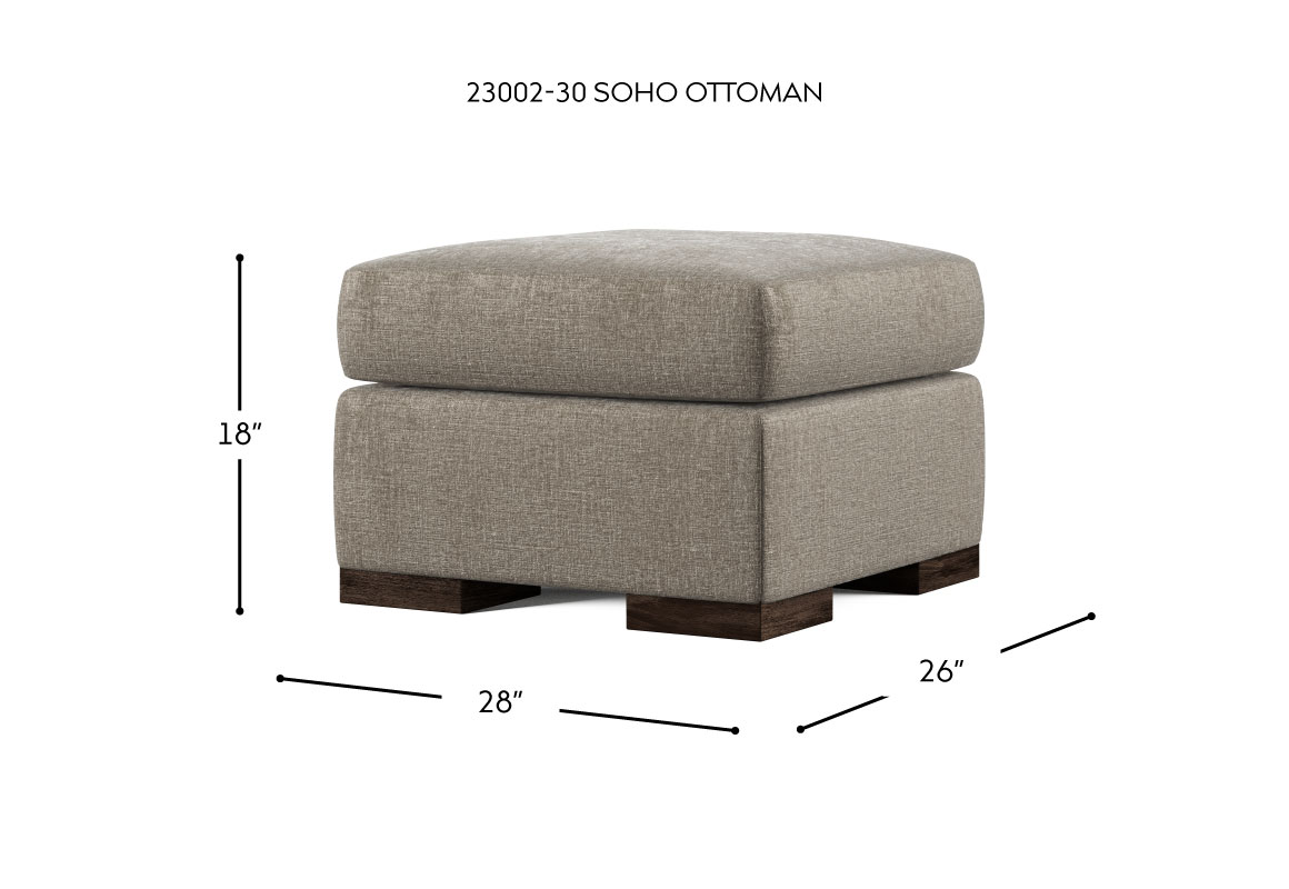 The Soho Ottoman is a fresh clean, contemporary design. This ottoman is thoughtfully designed to complement the Soho Sectional seamlessly, with dimensions that ensure a perfect fit for a cohesive and stylish look. With a versatile and modern design and endless customization options, the Soho Ottoman is the ottoman you’ve been looking for.