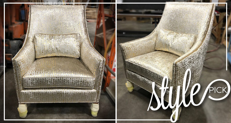 Our 11870 Lounge Chair, decked in COM (JF “Gossip”), is accented with Vogel’s “Oak” wood finish. We trimmed this “tree” with our customer’s preferred custom copper-coloured nailhead trim to create the perfect finishing touch for this comfortable and festive chair.